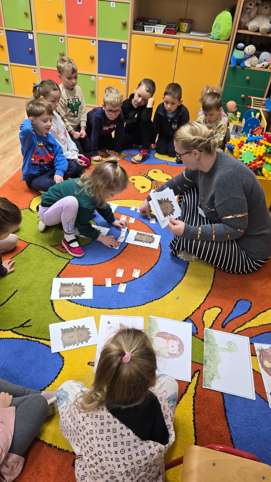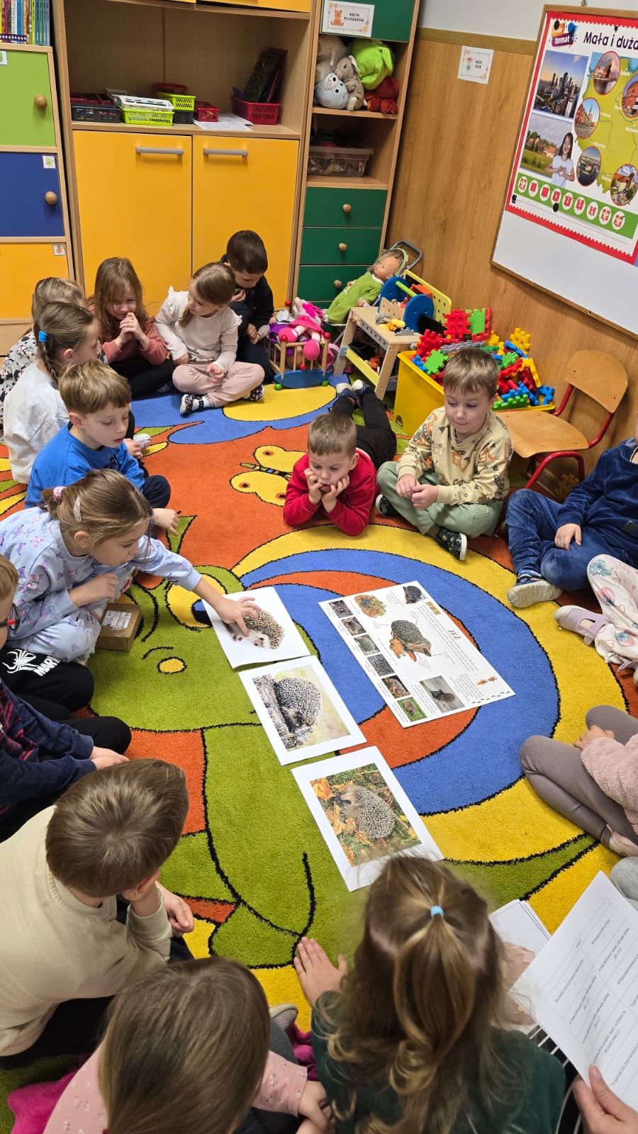 W listopadzie obchodzony jest corocznie - Dzień Jeża. To wyjątkowy dzień, który ma na celu przybliżenie dzieciom ich środowiska życia, co im zagraża, roli tych zwierząt w ekosystemie oraz potrzebę ich ochrony. Dlatego właśnie starszaki 3 listopada na wszystkich zajęciach poprzez różne aktywności poszerzały wiadomości dotyczące jeży. Przedszkolaki na zajęciach matematycznych przeliczały te ciekawe zwierzątka, klasyfikowały oraz rozwiązywały jeżowe sudoku. Wspólnie z dziećmi oglądaliśmy film edukacyjny, " Ciekawostki o jeżach", dzieci rozwiązywały też zagadki na temat jeży, rebusy oraz uczestniczyły w zabawach ruchowych. Na koniec starszaki stworzyły przepiekne prace plastyczne, które zdobią nasze gazetki. Ten dzień przyniósł dzieciom wiele radości.