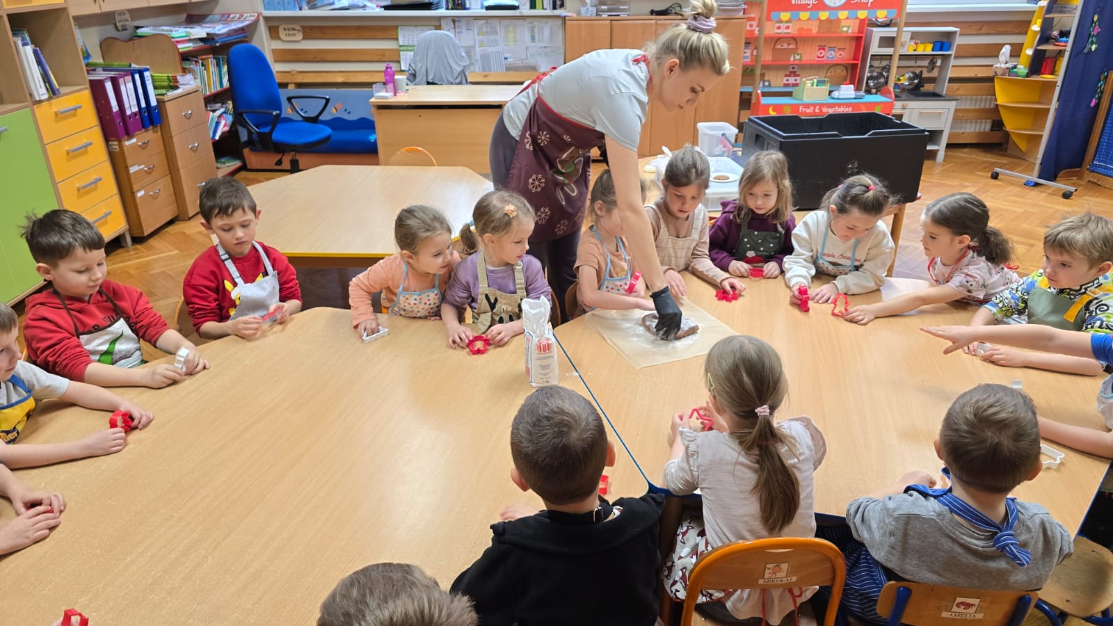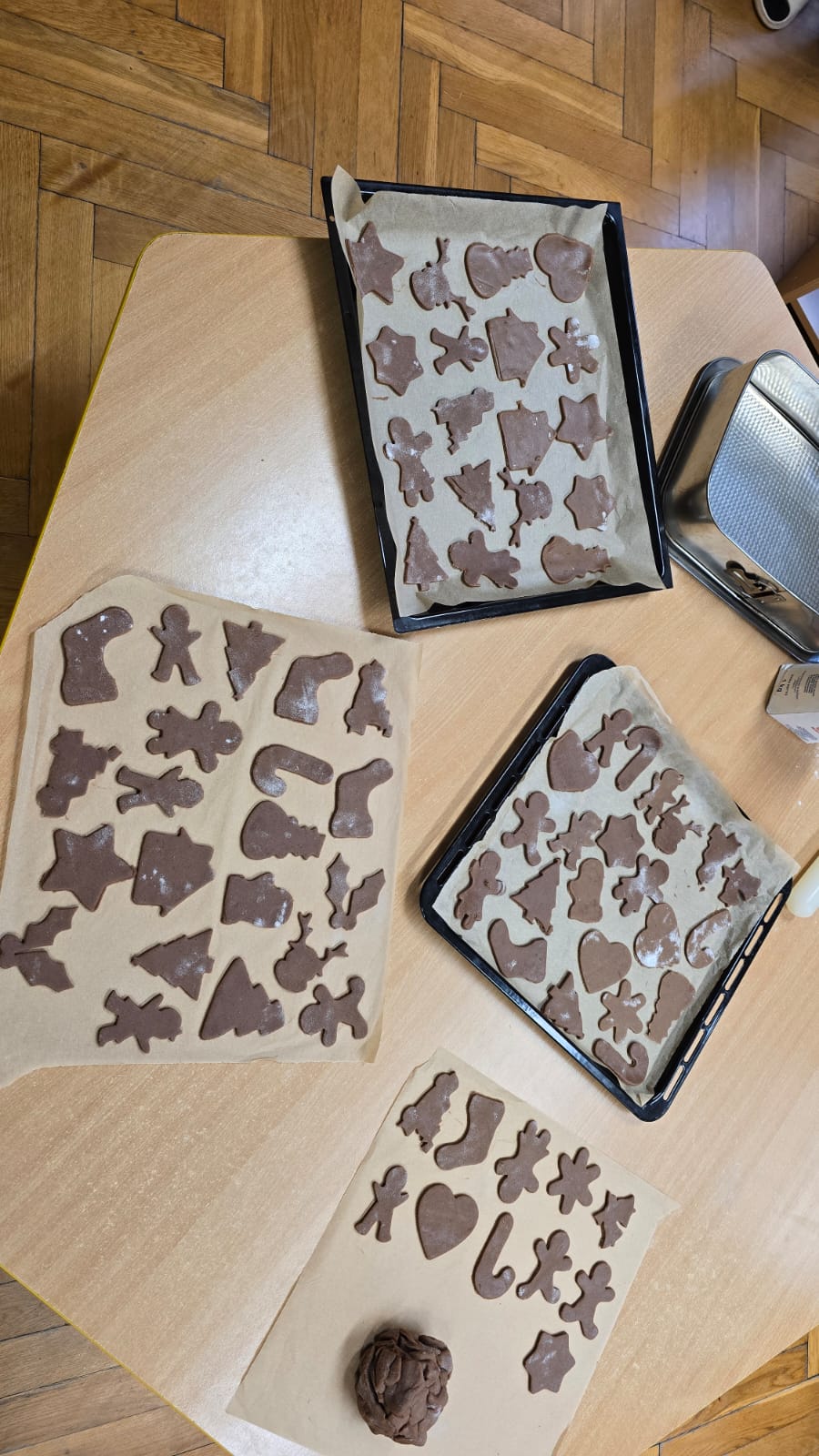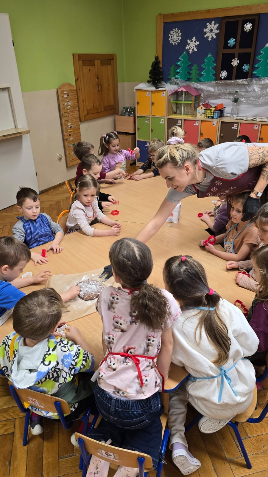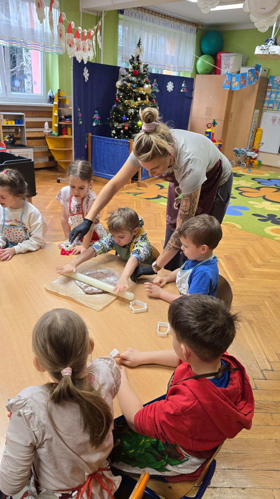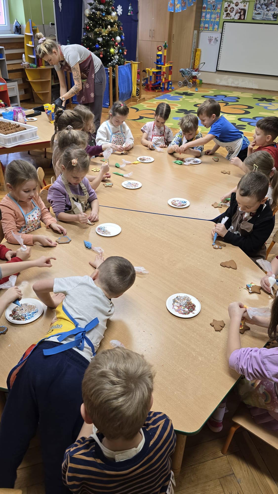 W dniu 15.12.25r. przedszkolaki z grupy I i II brały udział w warsztatach kulinarnych polegających na pieczeniu i zdobieniu pierniczków. Ten trzeci tydzień grudnia okazał się prawdziwą świąteczną przygodą! Nasze przedszkolaki nie tylko piekły i dekorowały pierniki, ale także poznawały składniki, z których powstaje ciasto. To była świetna okazja, by rozwijać zmysły i poszerzać wiedzę o kulinarnym świecie! Po wspólnym omówieniu składników rozpoczęło się mieszanie, zagniatanie i wałkowanie ciasta. Każde dziecko wykrawało ulubione kształty – choinki, gwiazdki, serduszka czy bałwanki. Kiedy pierniczki trafiły do piekarnika, w całym przedszkolu unosił się cudowny aromat świąt. A po upieczeniu przyszedł czas na najlepszą część — dekorowanie! Lukier, posypki i czekolada zamieniły nasze wypieki w małe dzieła sztuki.