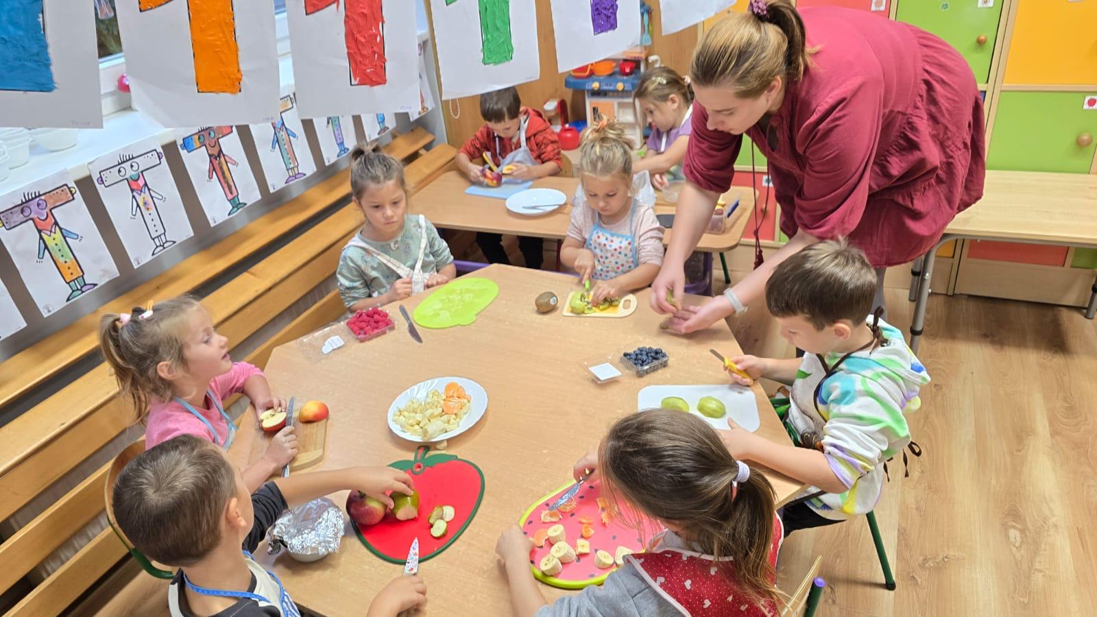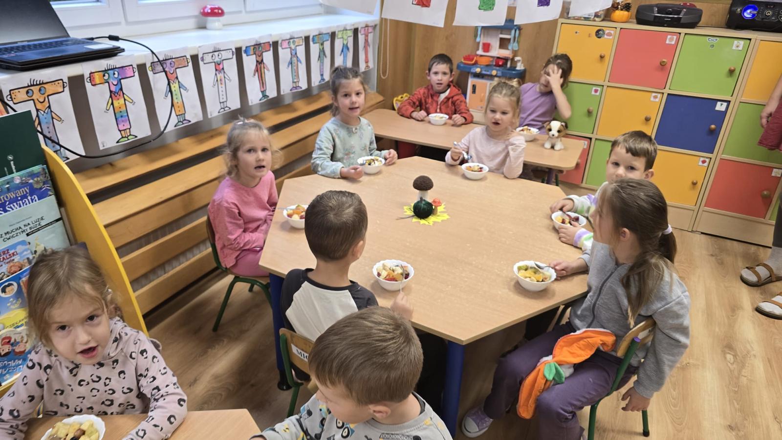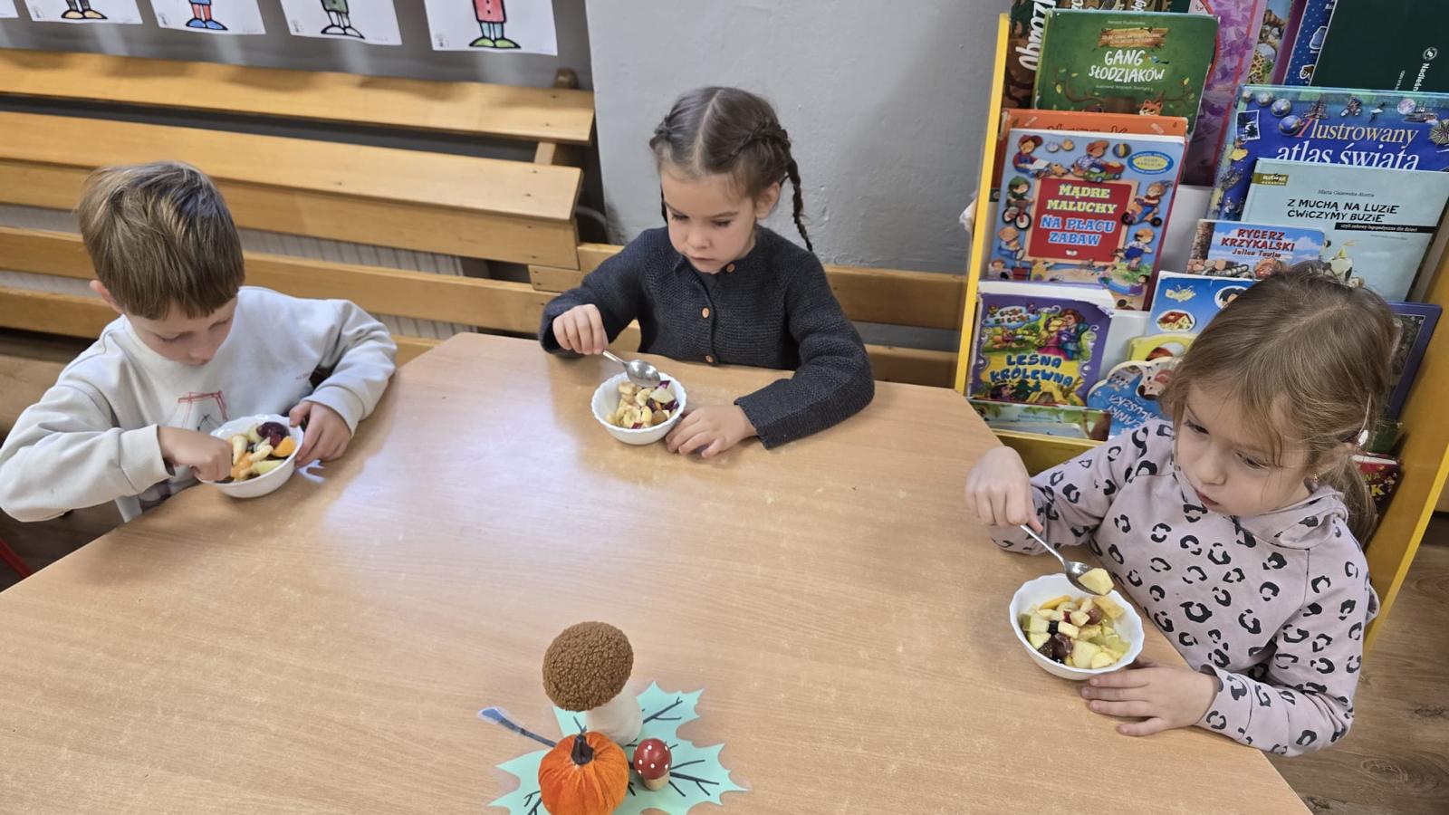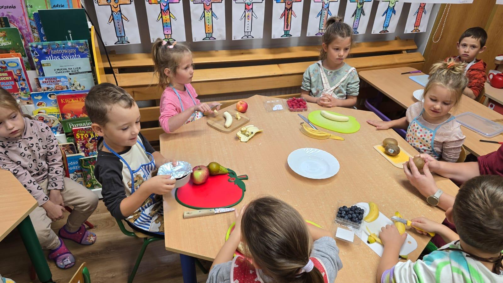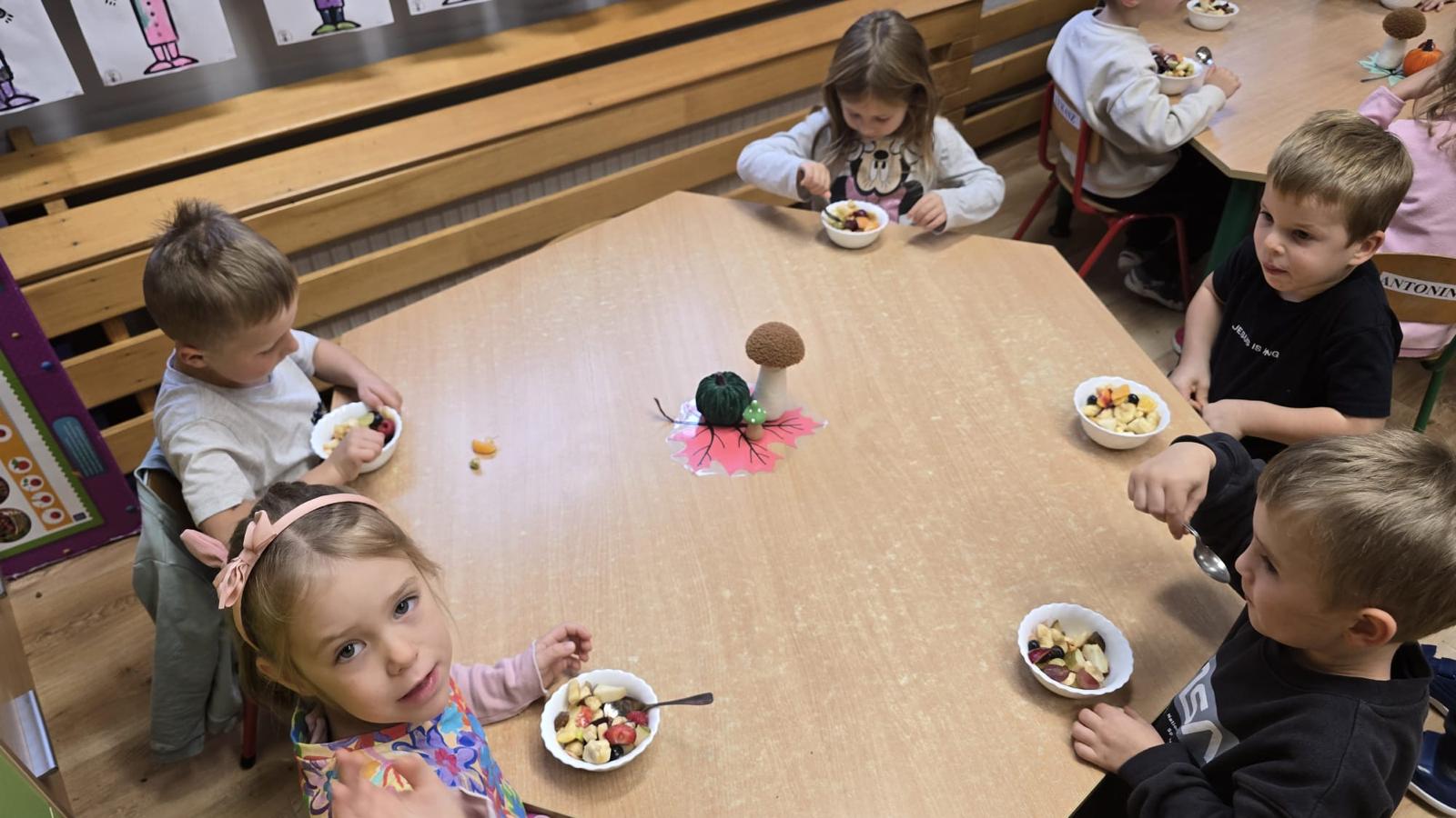 We wtorek 30 września dzieci z grupy II na zajęciach własnoręcznie przygotowały pyszną, witaminową sałatkę. Przedszkolaki przyniosły z domów różne świeże owoce. Były jabłka, gruszki, banany, kiwi, pomarańcze, mandarynki, winogrona, a nawet truskawki i maliny. Wszyscy mieli soczyste minki na widok tak smakowitych owoców i każdy ochoczo zabrał się do pracy. Dokładnie umyliśmy rączki, potem ubraliśmy fartuszki, w których wyglądaliśmy jak prawdziwe kuchciki, a następnie posegregowaliśmy umyte wcześniej owoce. Każdy dostał talerzyk, nożyk i tak przystąpiliśmy do krojenia. Dzieci samodzielnie kroiły i przyrządzały sałatkę owocową przestrzegając zasad bezpieczeństwa przy posługiwaniu się nożem. Przyrządzanie sałatki dało dzieciom wiele satysfakcji jednocześnie uświadamiając, jak ważną rolę odgrywają witaminy we właściwym funkcjonowaniu organizmu- zapoznając się z treściami programu edukacyjnego Klub Zdrowego Przedszkolaka. Sałatka udała się, wyszła wspaniałe i bardzo smacznie !