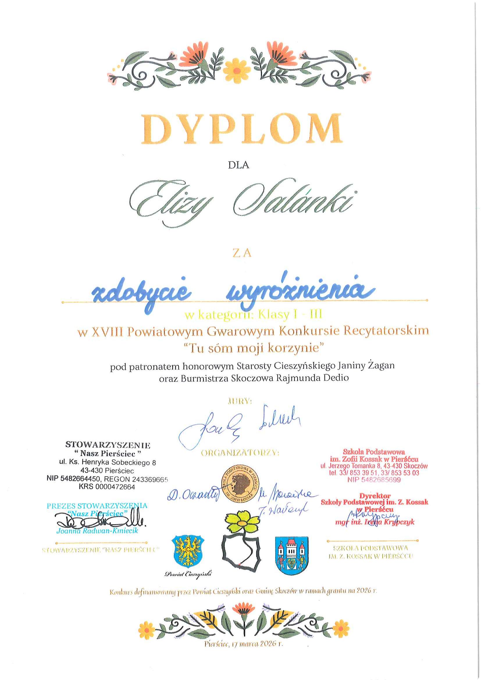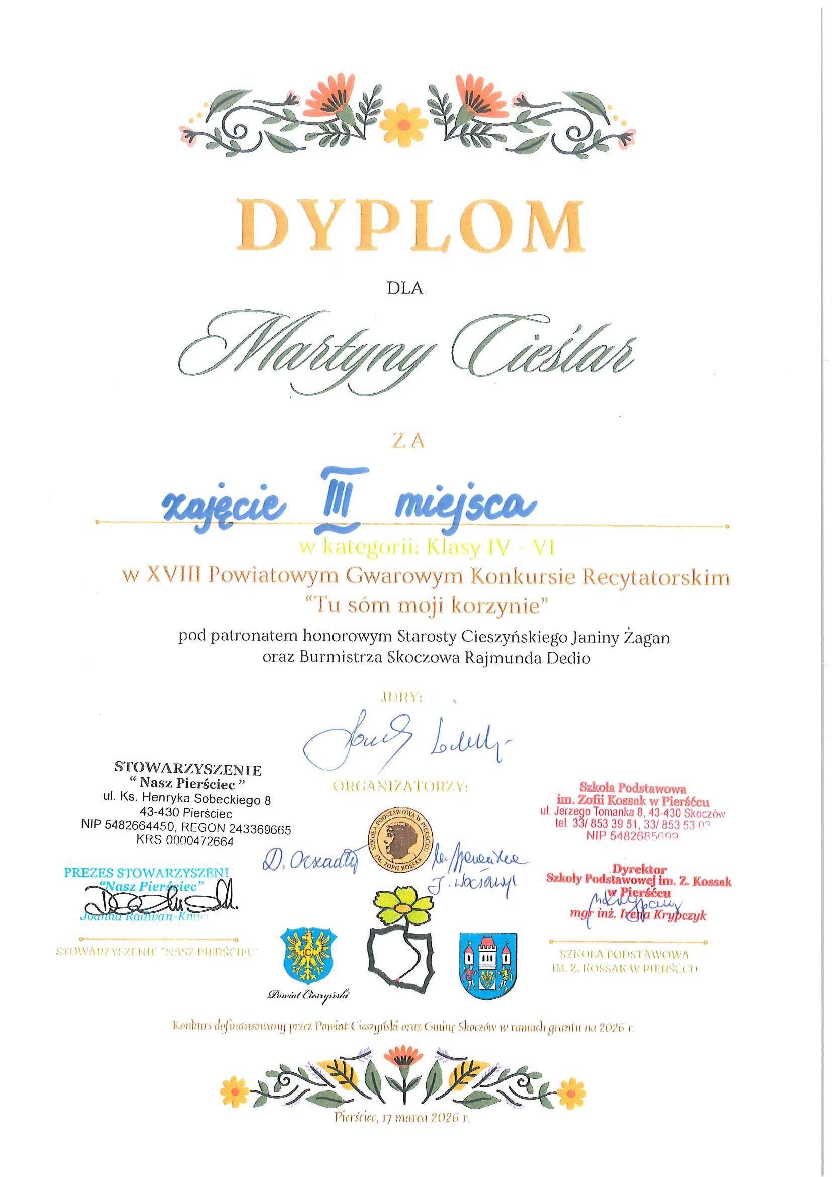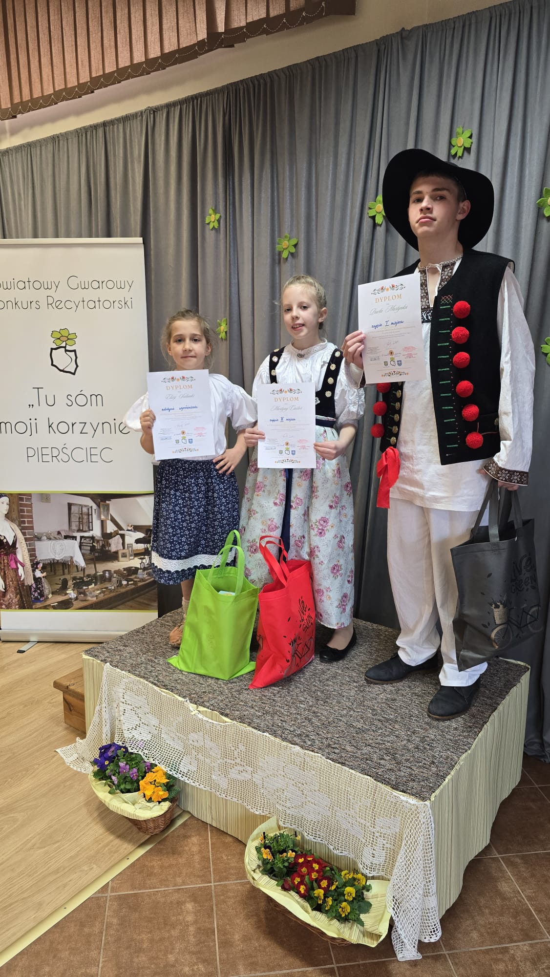 Z ogromną radością i dumą informujemy o wybitnych osiągnięciach naszych uczniów podczas XVIII Powiatowego Gwarowego Konkursu Recytatorskiego „Tu sóm moji korzynie”. Reprezentanci naszej szkoły po raz kolejny udowodnili, że wiślańska mowa nie jest im obca, a pielęgnowanie tradycji mają we krwi.