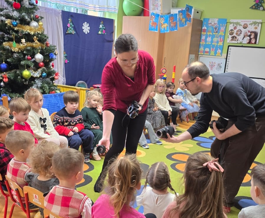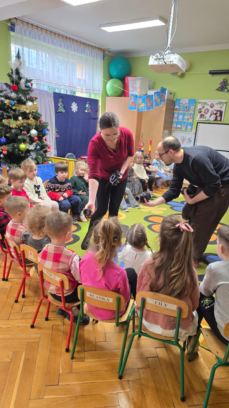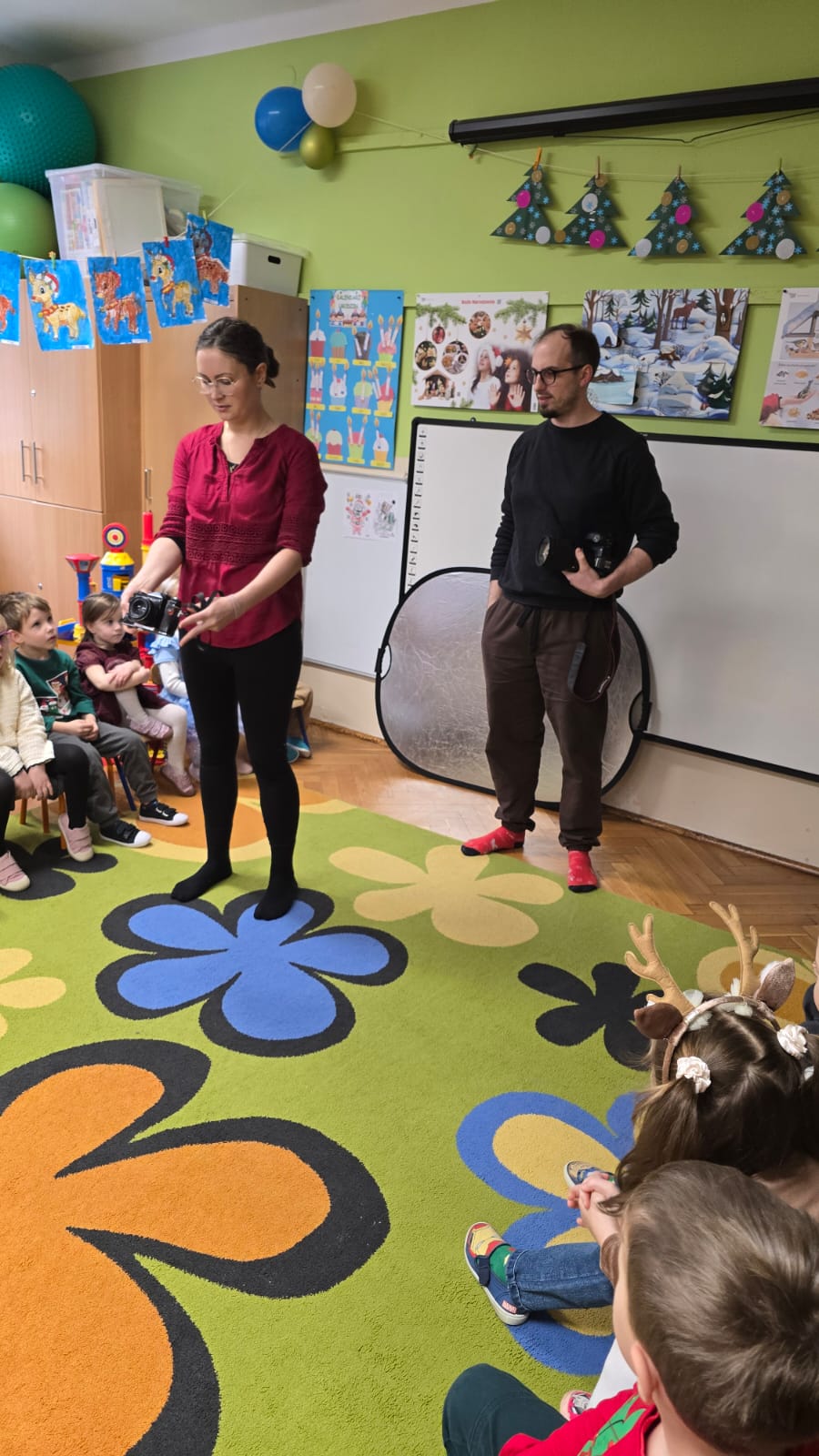 12 grudnia w naszym przedszkolu odbyła się sesja świąteczna dla dzieci. W ramach prooriętacji zawodowej odwiedzili nas rodzice Tomka, Państwo Alicja i Tymoteusz Cieślar. Przygotowali dla naszych dzieci przepiękną scenerię do sesji świątecznej, opowiedzieli dzieciom o tym jak wygląda praca fotografa i jakich rekwizytów wykorzystuje się podczas sesji zdjęciowych. Pan Tymoteusz opowiedział przedszkolakom o swojej pasji, pokazał im różne rodzaje aparatów fotograficznych oraz inny, niezbędy sprzęd każdego fotografa. Wyjaśnił również dzieciom jaki rodzaj zdjęć można wykonywać i w jaki sposób to robić. Na zakończenie każdy przedszkolak wziął udział w sesji zdjęciowej co sprawiło dzieciom ogromną radość. Bardzo serdecznie dziękujemy Państwu Cieślar za takie niezwykłe spotkanie.
