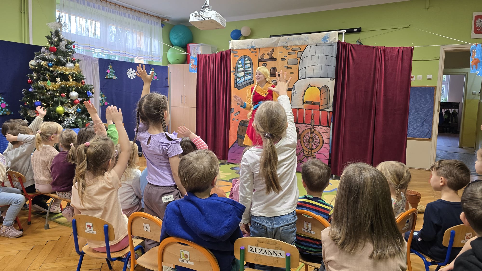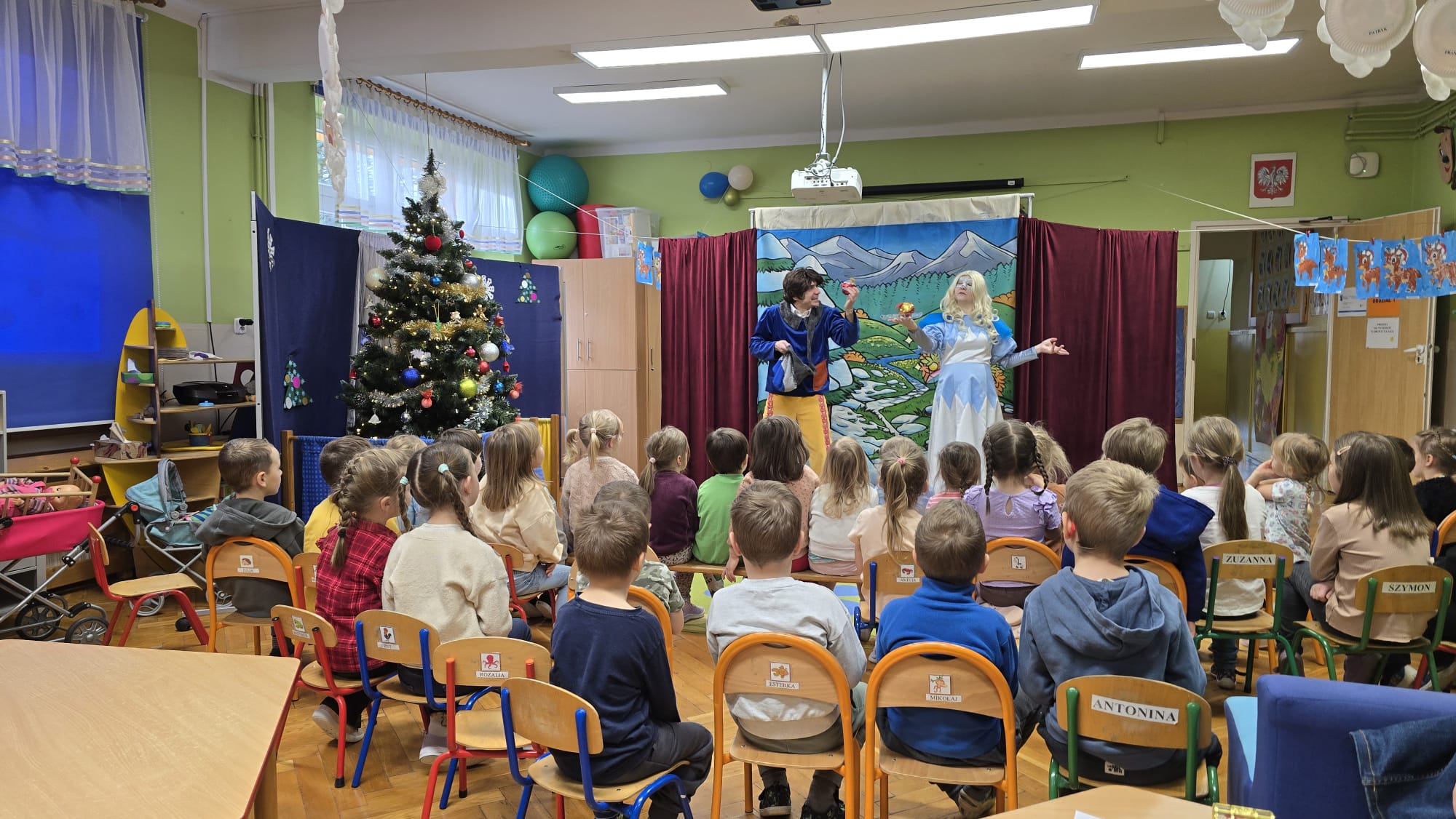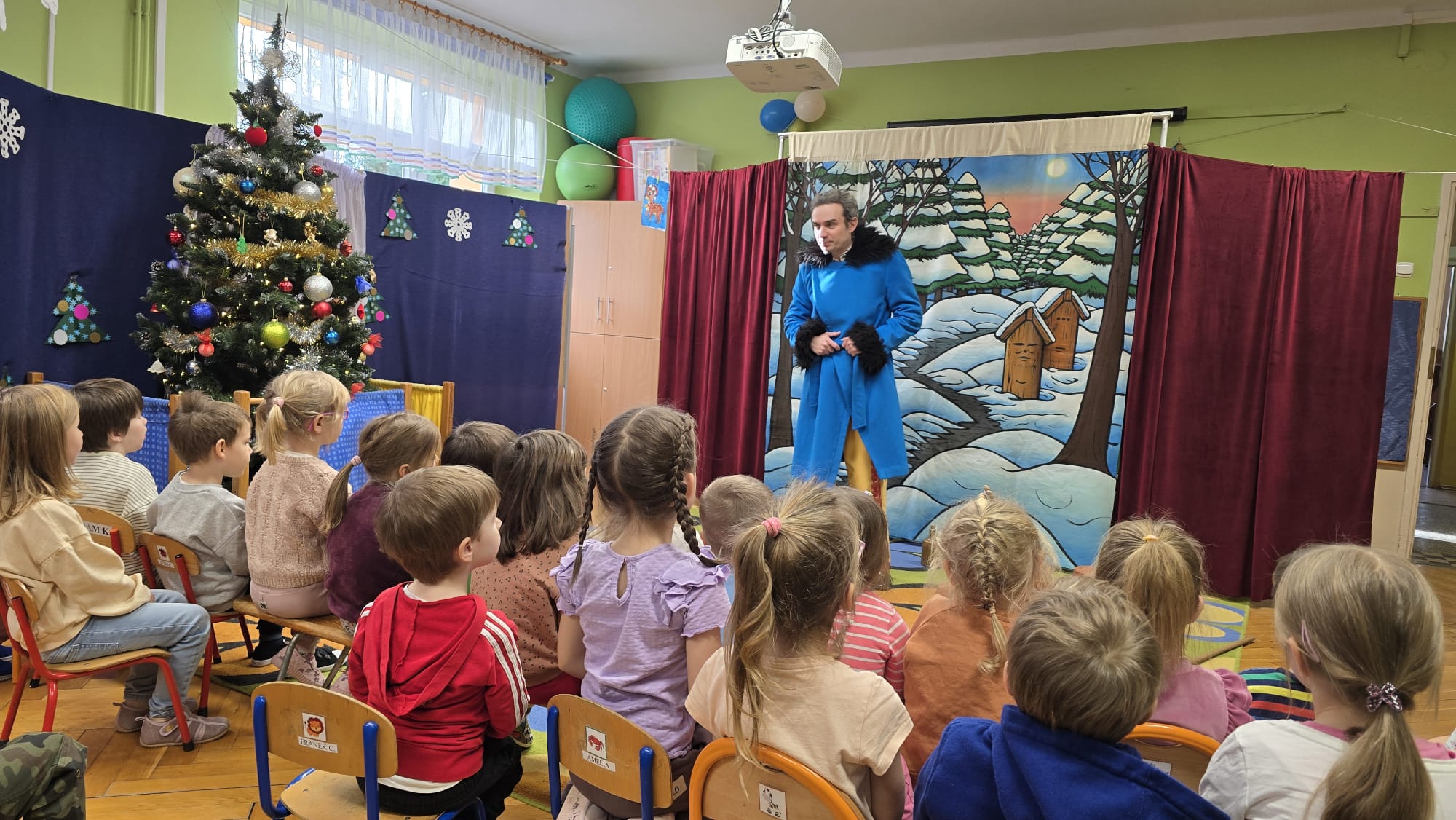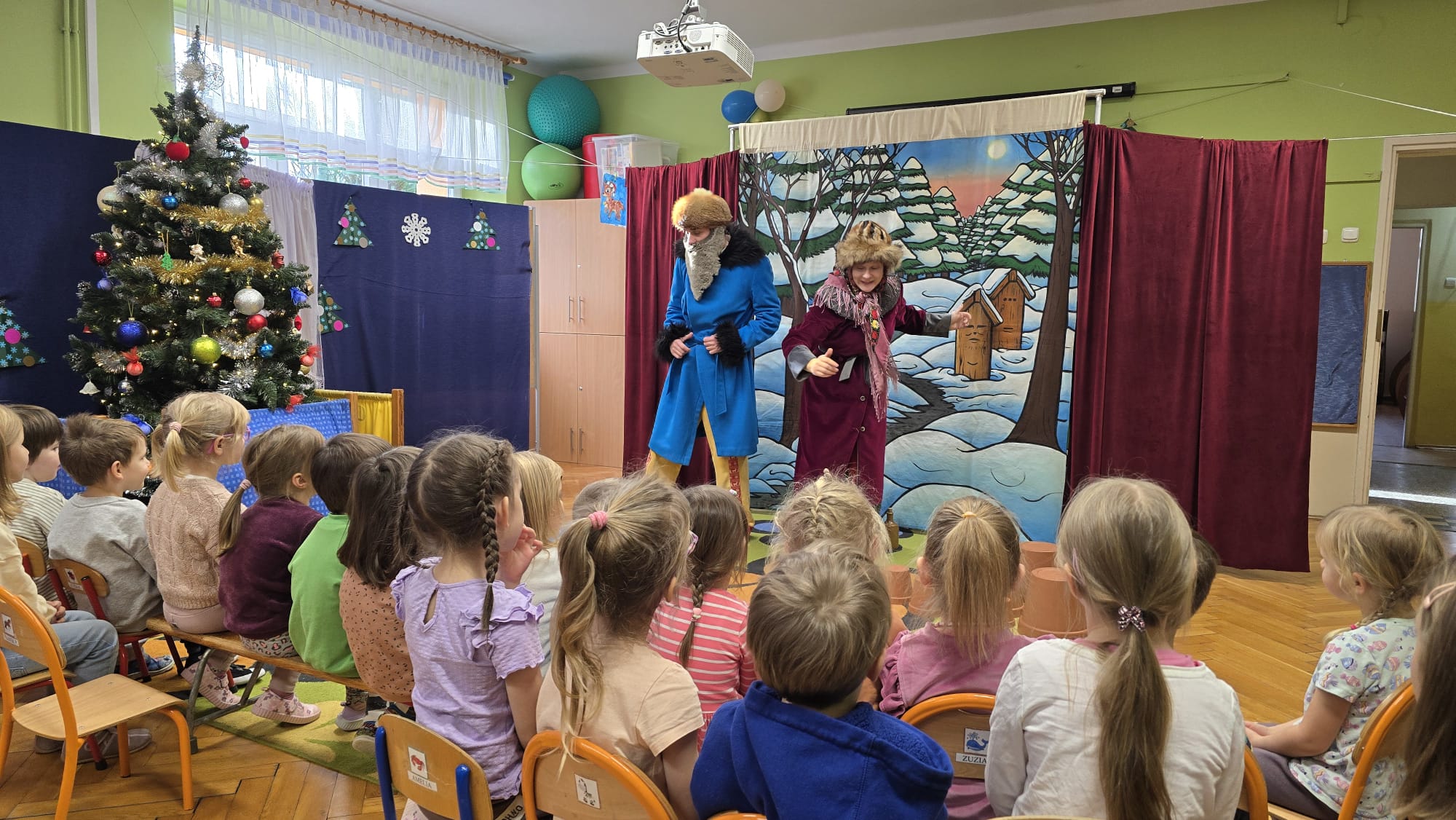 W dniu 16.10.25r. przedszkolaki z grupy I i II uczestniczyły w spektaklu pt.: "Najcenniejszy skarb zimy", który został wystawiony przez aktorów z teatru „Bajkowe Skarbki Śląska”. Opowieść ta rozgrywa się w zimowej scenerii otoczonej górami doliny. W małym domku zamieszkują dziadek z babcią, którzy mają dwoje wnucząt – Borysa i Maszę. Przy okazji zbierania chrustu dostrzegają zaczarowany, gliniany dzbanek. Dziadek uwalnia uwięzioną w dzbanku pszczołę, która informuje ich o Najcenniejszym Skarbie Zimy strzeżonym przez Króla i Królową Zimowego Ogrodu. O Skarbie dowiaduje się także wnuczek – Borys. Dzieci podczas spektaklu mogły nie tylko oglądać przedstawienie, ale miały okazję aktywnie w nim uczestniczyć. Dziękujemy aktorom za zabranie nas w podróż, podczas której dzieci mogły się dowiedzieć jak dobro przezwycięża wszelkie przeciwności losu, a współczucie i chęć pomocy innym zawsze zostają wynagrodzone.