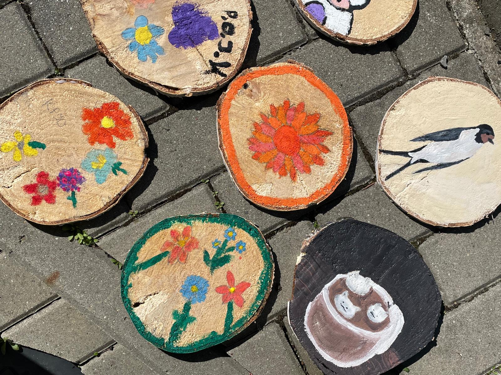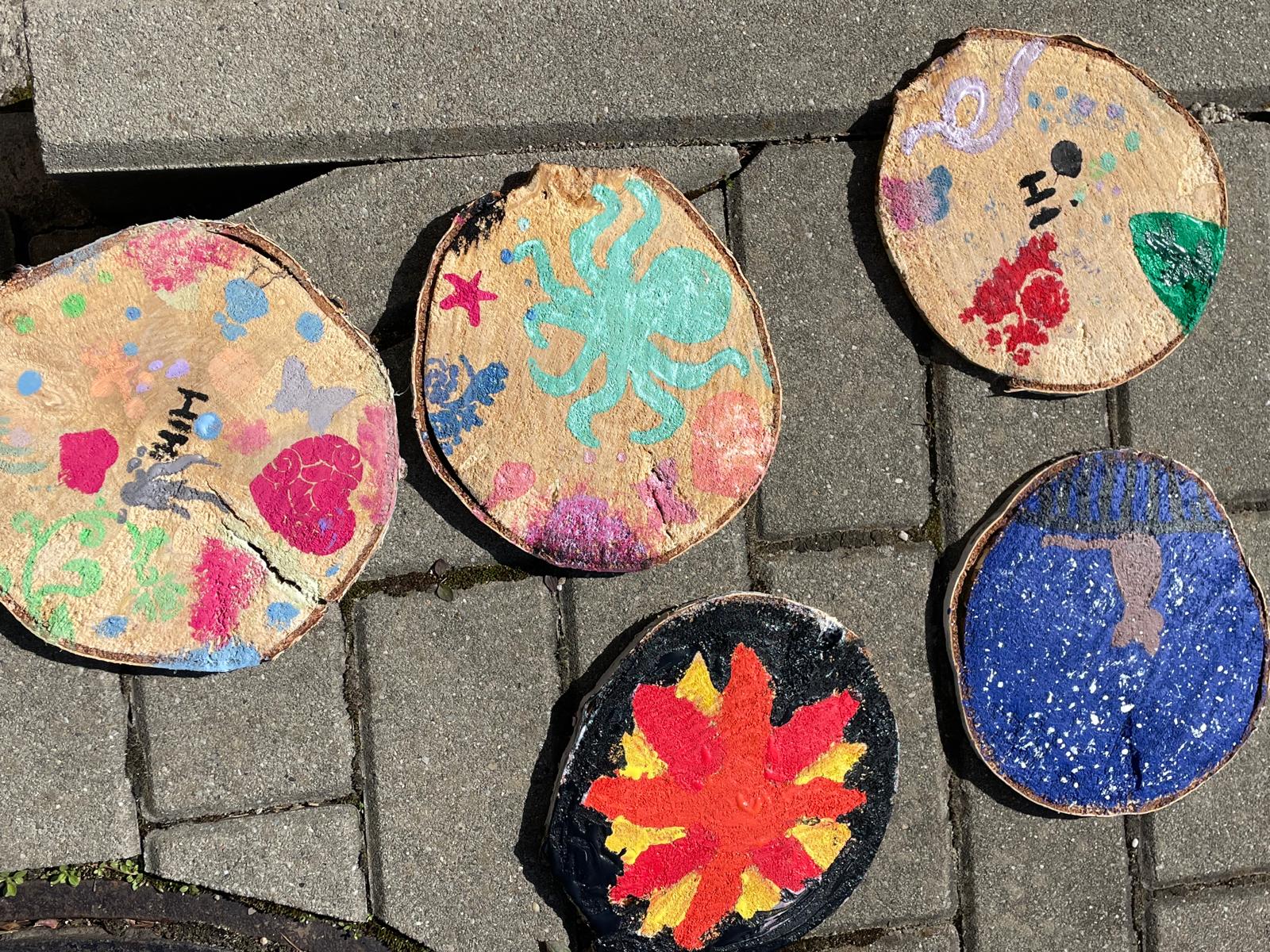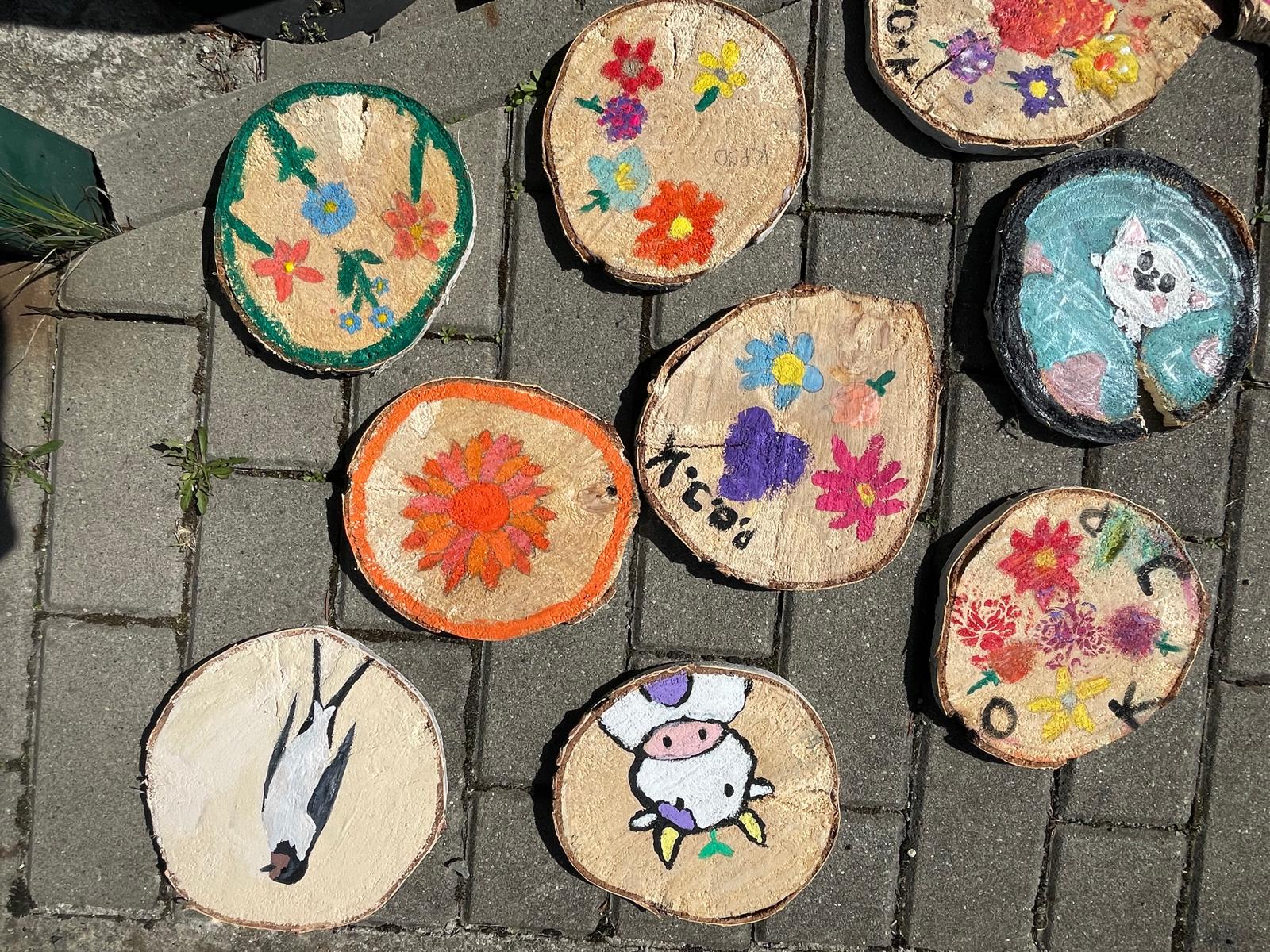 W ruch poszły papier ścierny, klej na gorąco, farby akrylowe, lakier bezbarwny i… cudne drewniane podkładki pod dzbanek gotowe:) prawdziwa sztuka użyteczna!