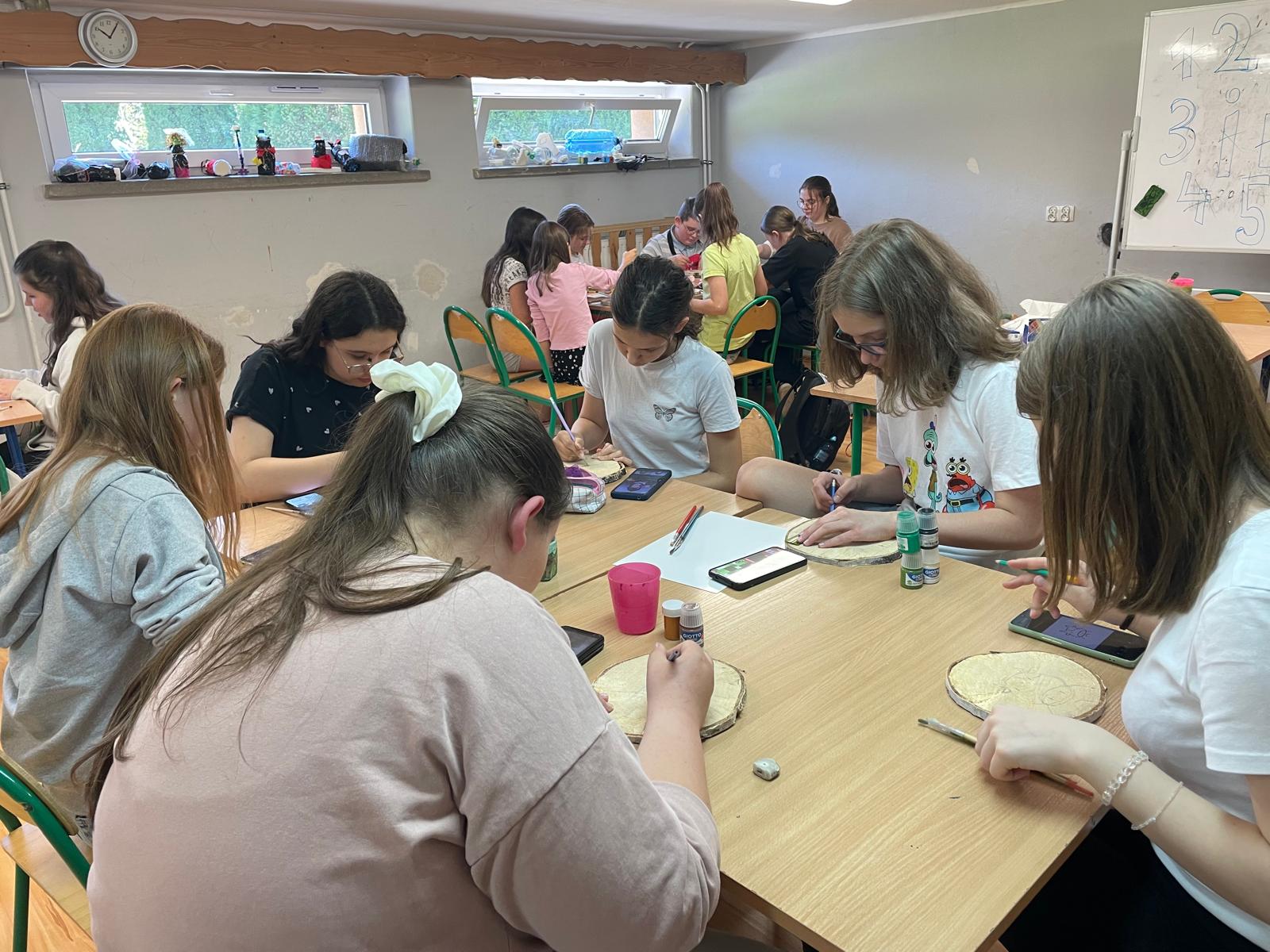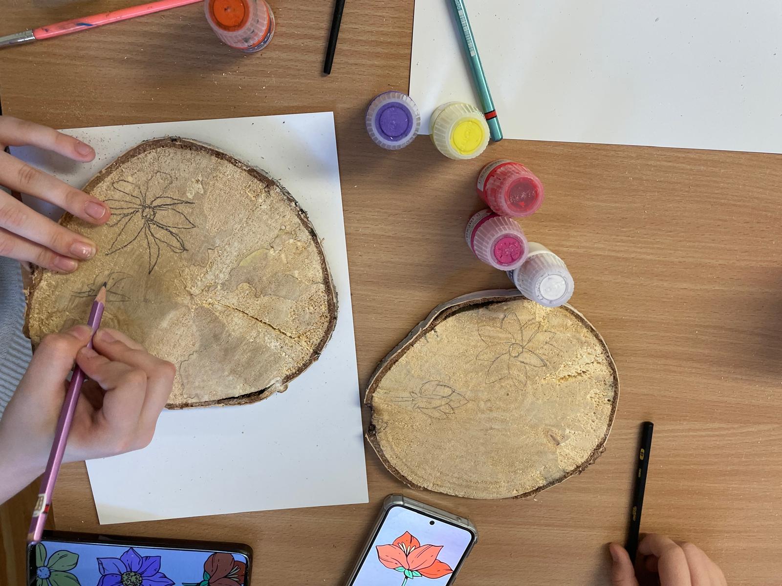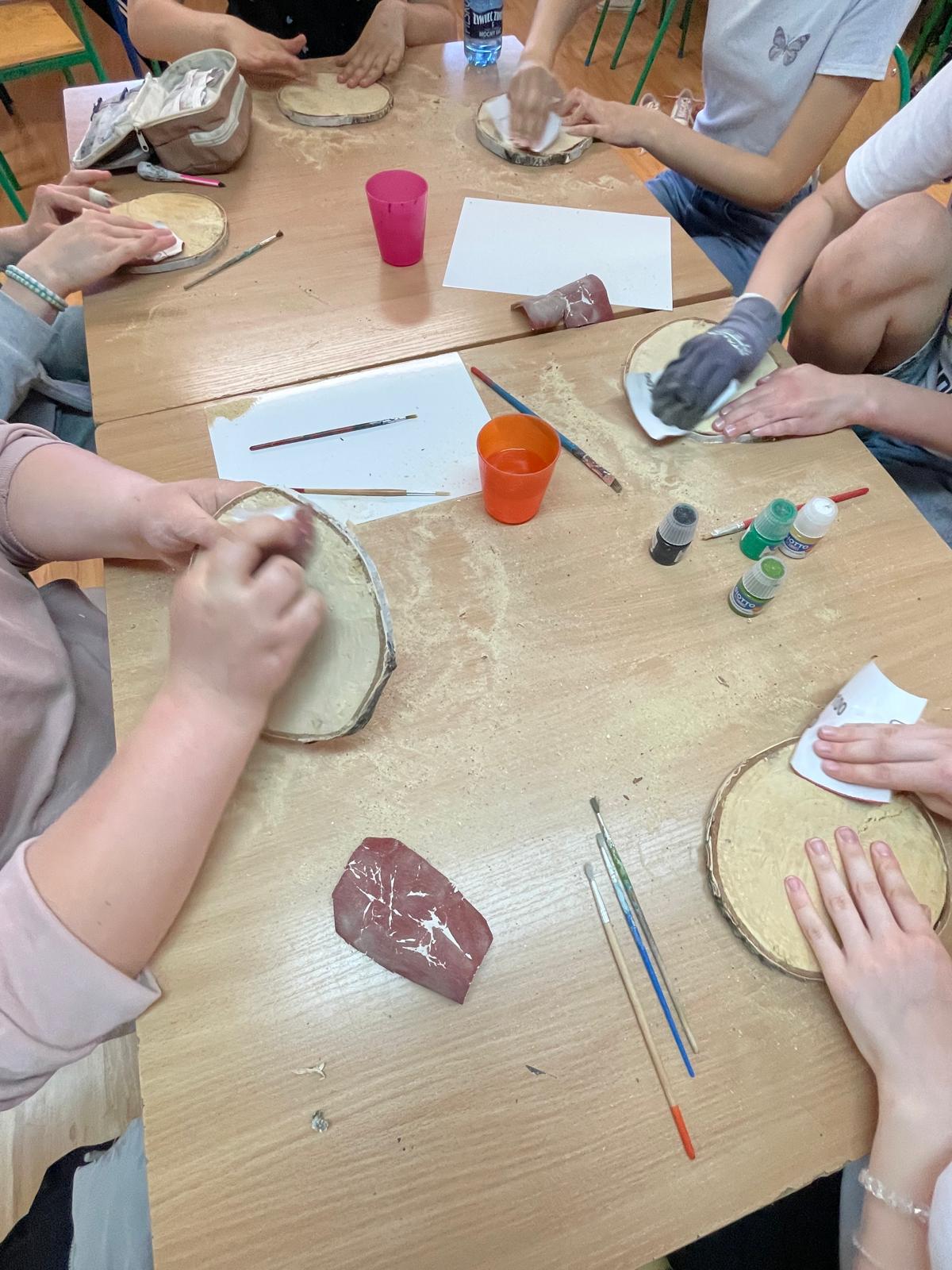 W ruch poszły papier ścierny, klej na gorąco, farby akrylowe, lakier bezbarwny i… cudne drewniane podkładki pod dzbanek gotowe:) prawdziwa sztuka użyteczna!