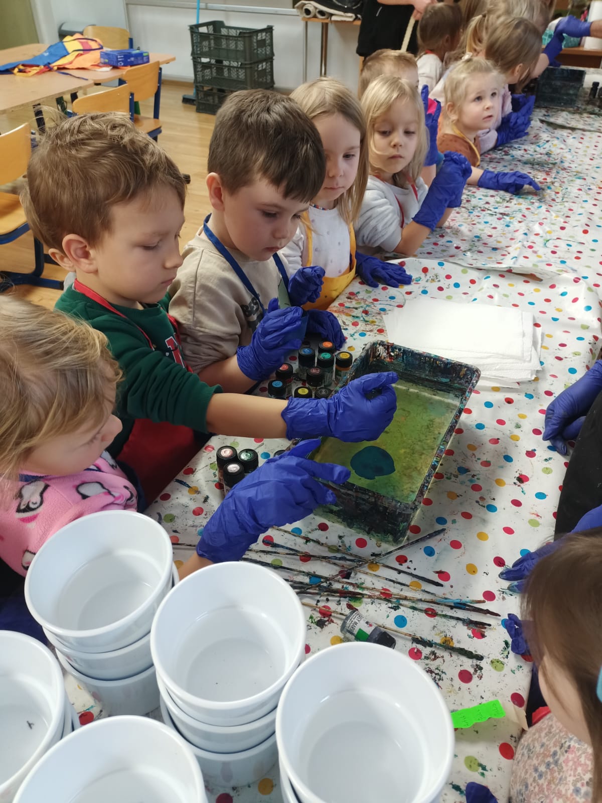 Dzieci, z dużym zainteresowaniem i entuzjazmem, obserwowały jak barwy rozlewają się po wodzie. Przy pomocy patyczków mogły delikatnie mieszać kolory, tworząc niepowtarzalne kompozycje. Kolejnym etapem było zanurzenie doniczki w wodzie, dzięki czemu wzór przenosił się na jej powierzchnię. Każda praca była wyjątkowa i jedyna w swoim rodzaju.