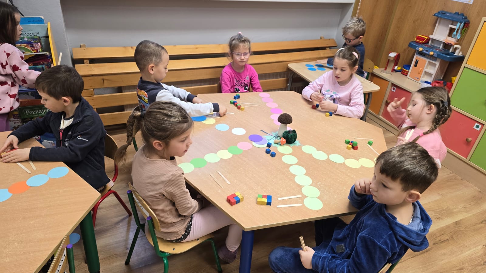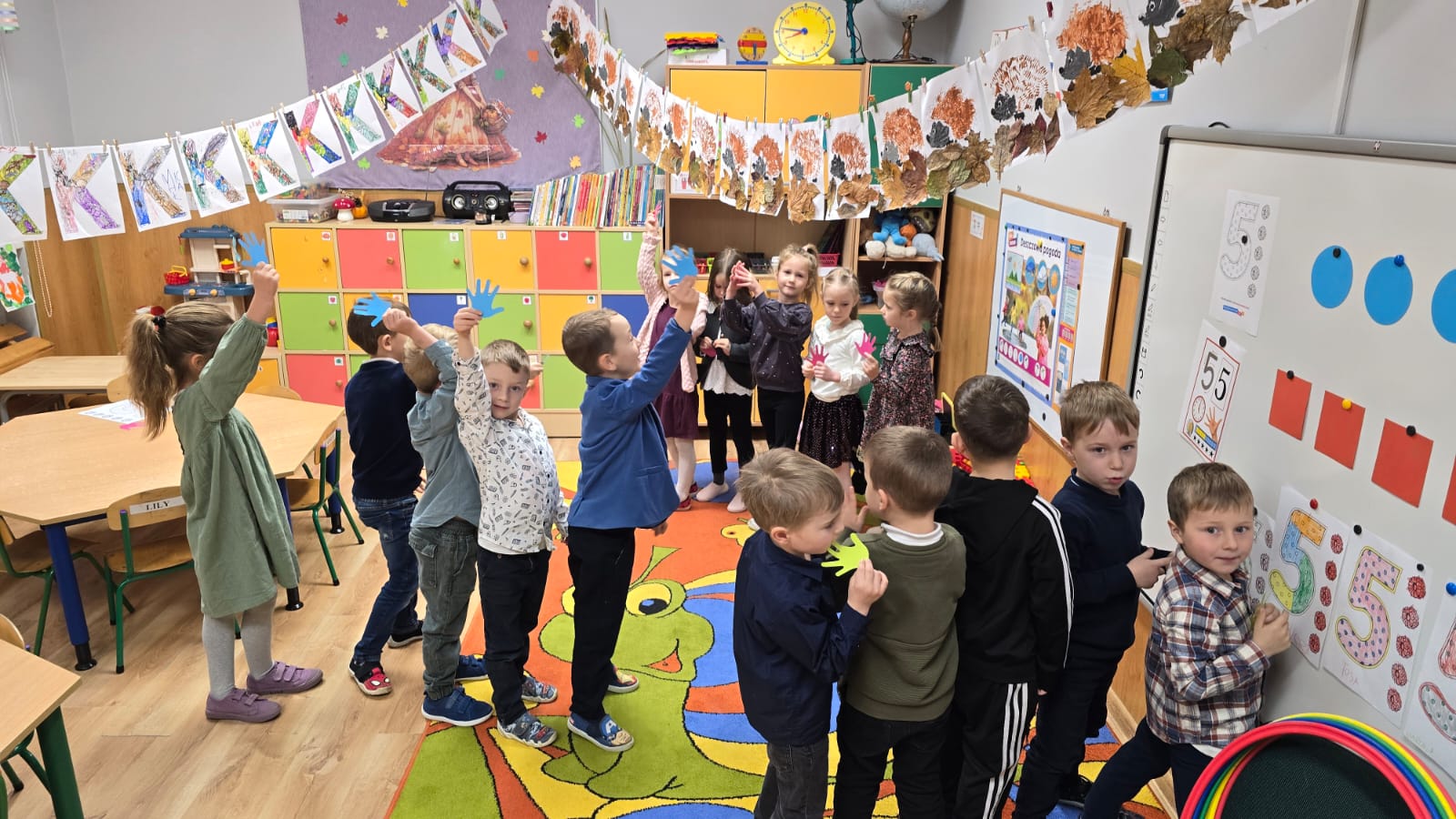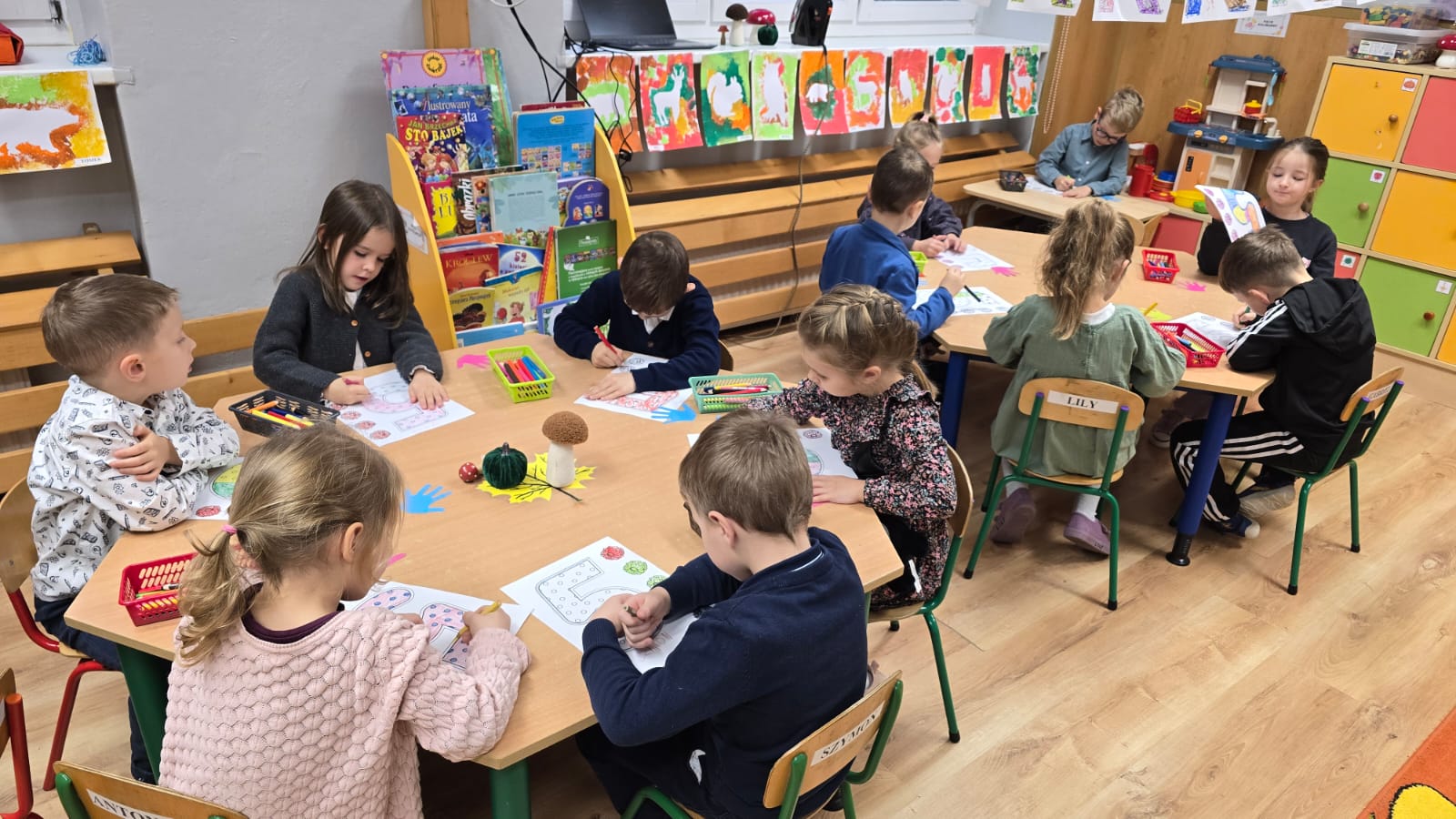 Na zajęciach matematycznych w listopadzie starszaki poznały następujące znaki matematyczne takie jak >, większy, <, mniejszy i =, równy oraz cyfry 4 i 5. Podczas wszystkich zajęć starszaki ćwiczyły przeliczanie i klasyfikowanie przedmiotów do odpowiednich zbiorów oraz utrwalaly poznane znaki i cyfry podczas zabaw i w trakcie wykonywanych kart pracy.