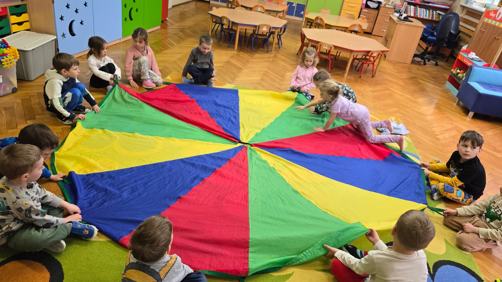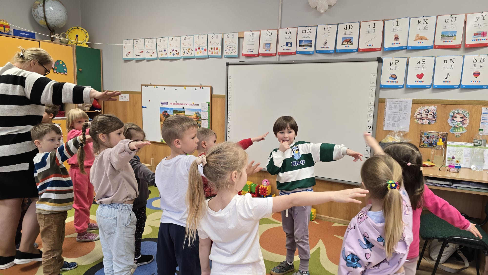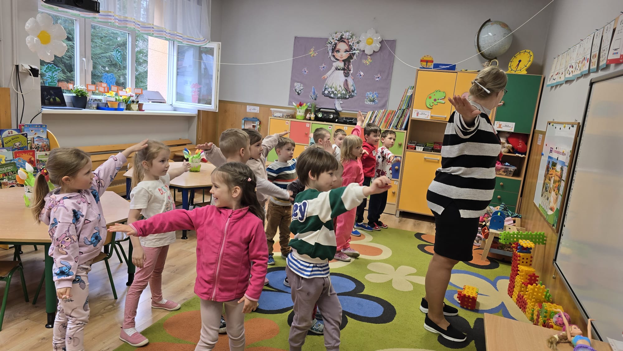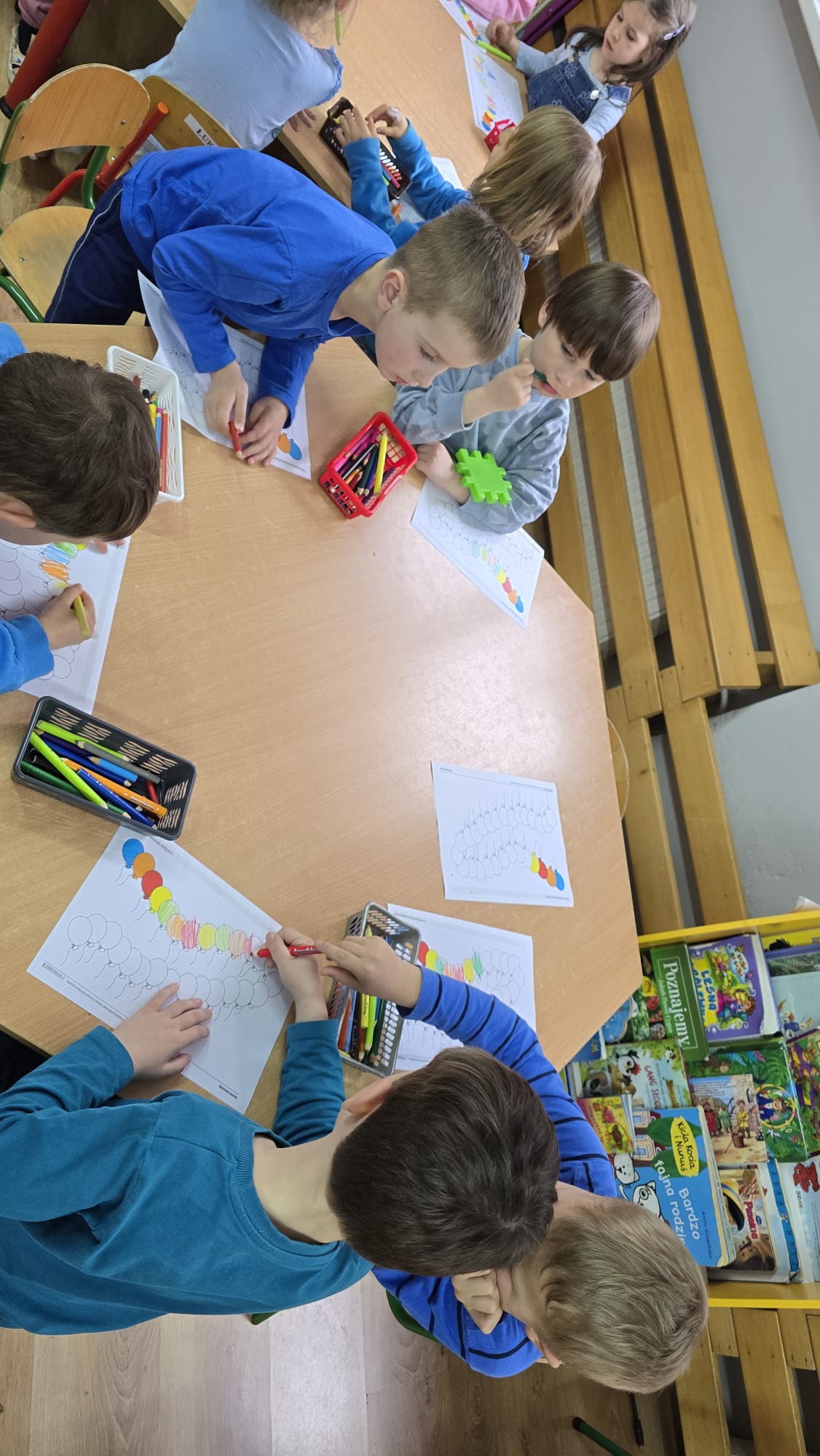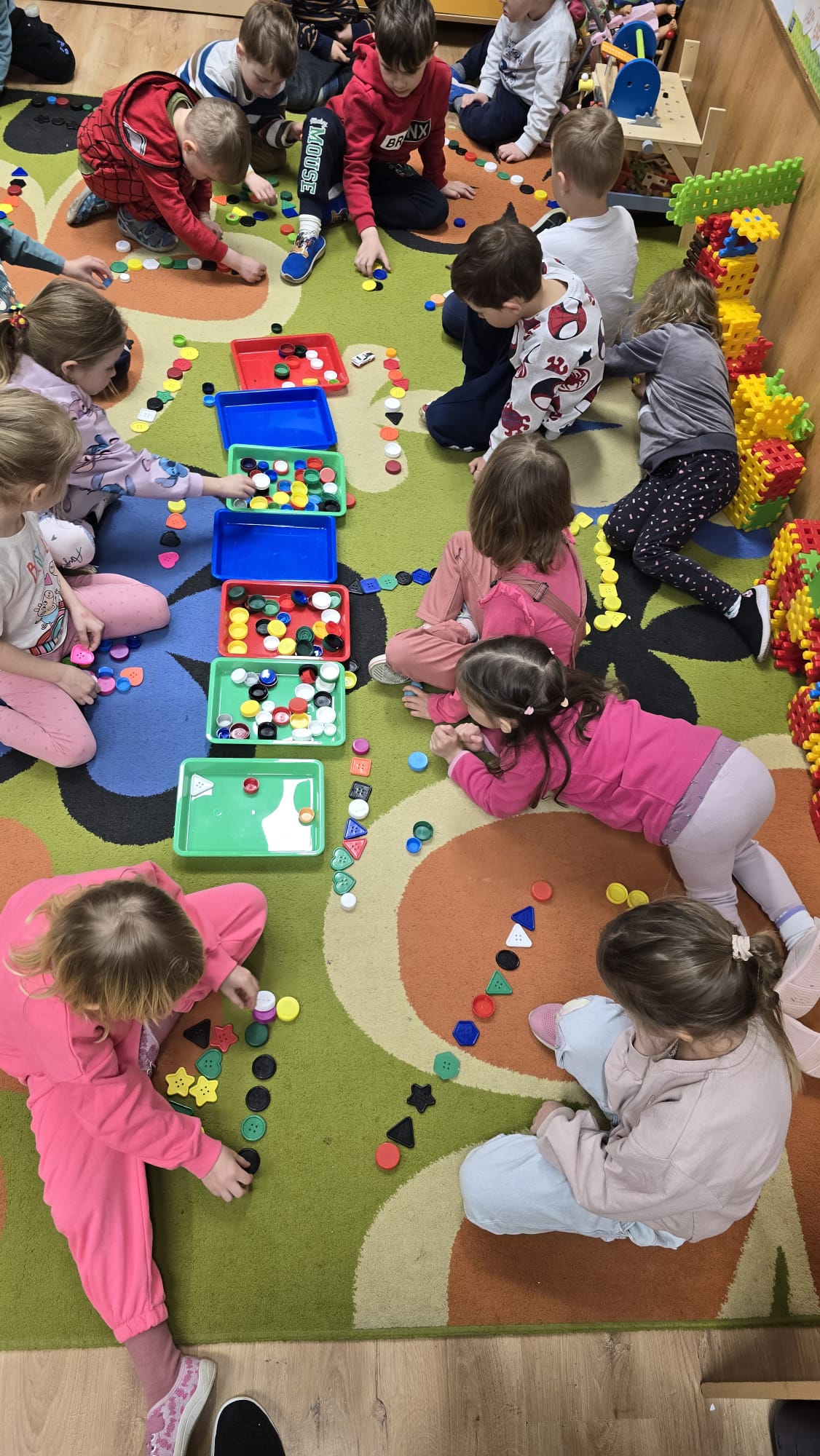 Zajecia matematyczne prowadzone w ramach projektu unijnego w kwietniu skupiały się wokół rytmów. Przedszkolaki poznały rytmy w przyrodzie i tworzyły je same między innyni za pomocą kolorowych nakrętek.