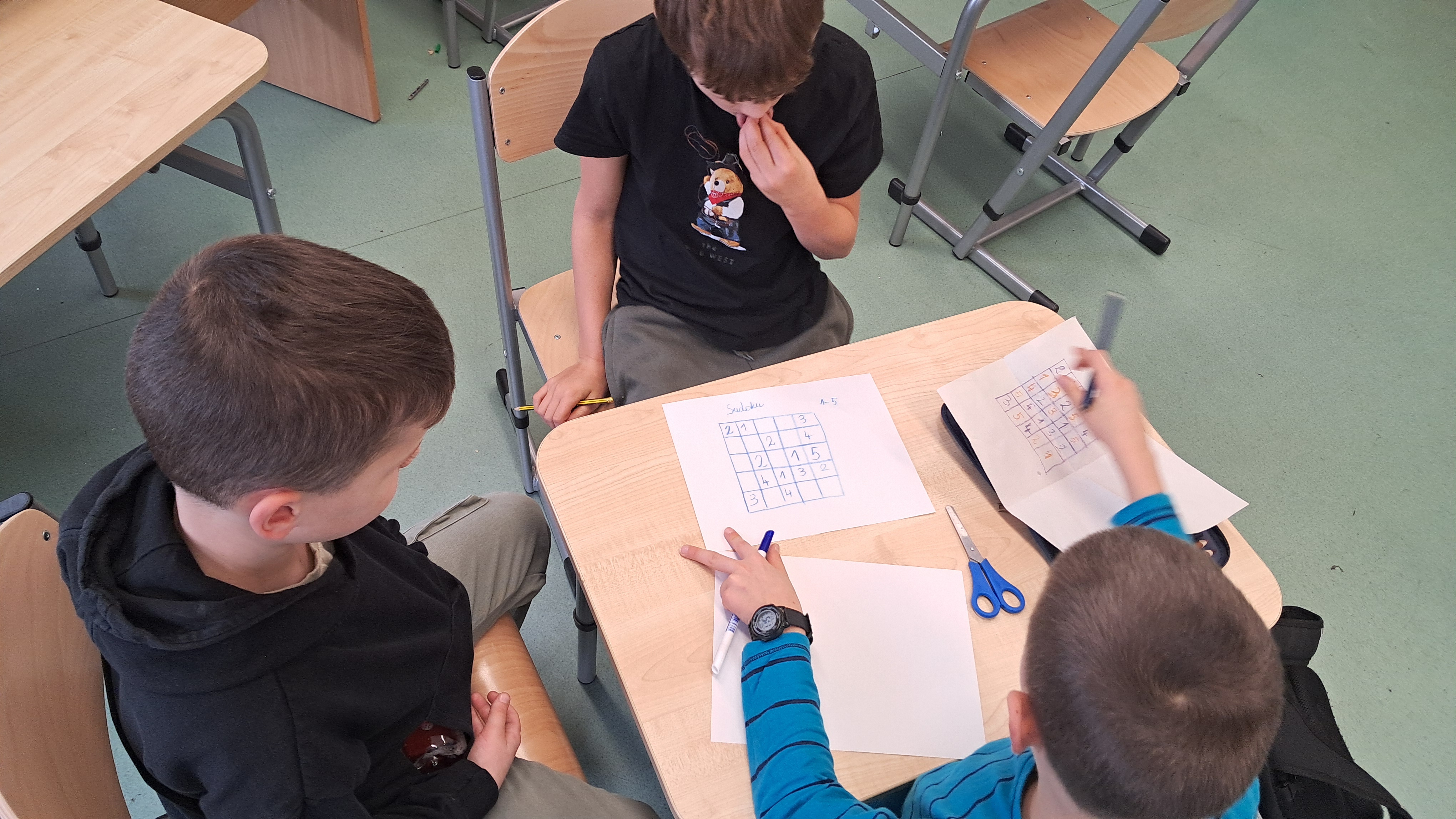 Kolejnym etapem zajęć było samodzielne tworzenie własnych plansz sudoku. Uczniowie projektowali układy, uzupełniali wybrane pola i sprawdzali, czy przygotowane przez nich zadania można rozwiązać w sposób logiczny.