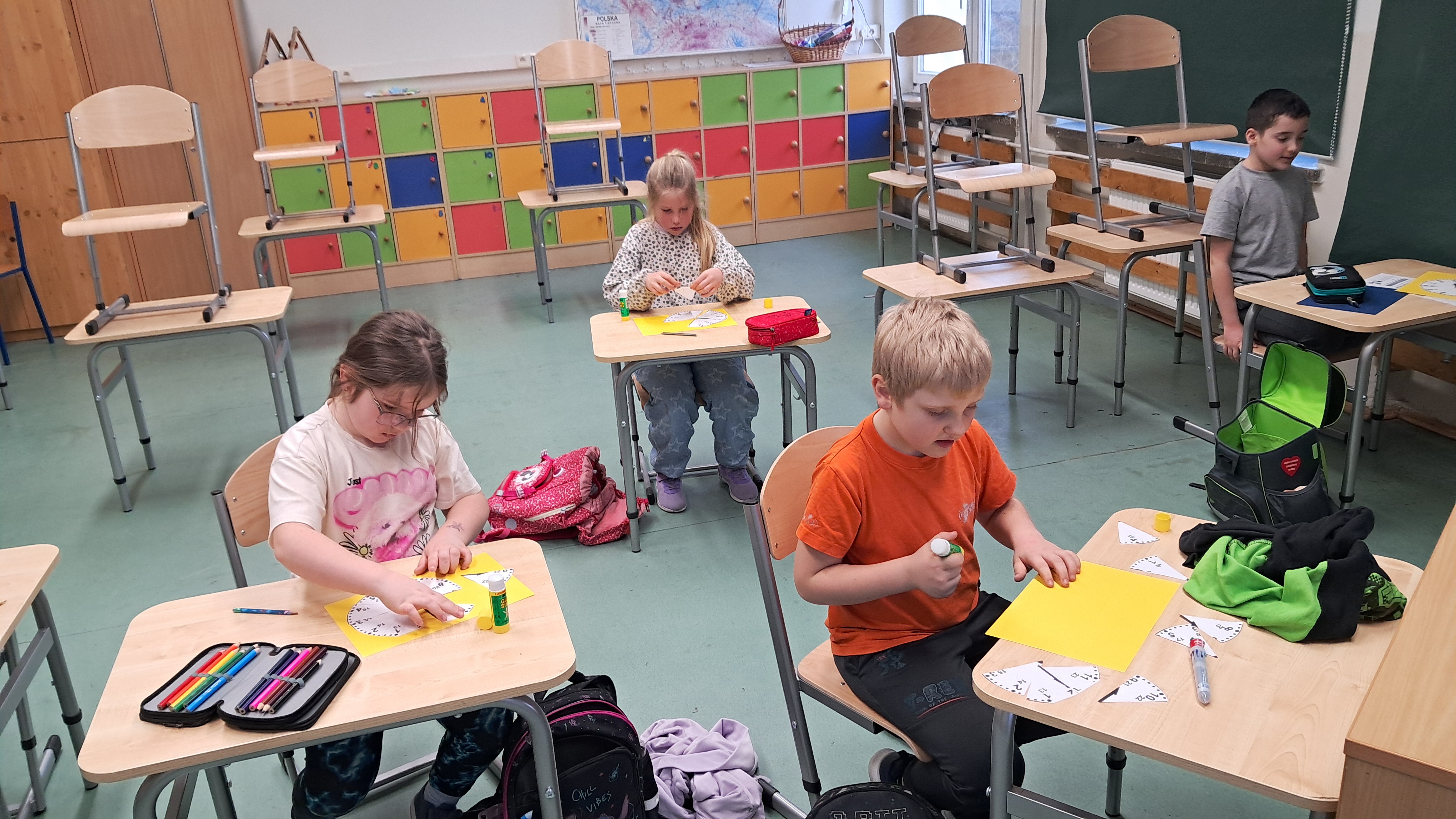 Podczas zajęć z matematyki wyrównawczej uczniowie klasy II utrwalali i doskonalili umiejętności związane z obliczeniami zegarowymi, odczytywaniem i zapisywaniem godzin na zegarze oraz obliczaniem upływu czasu. Ćwiczyli również rozpoznawanie i zapisywanie liczb rzymskich w podstawowym zakresie (I–XII), łącząc je z tarczą zegara. Uczniowie utrwalali mnożenie przez 5 i 10 w zakresie 100, zwracając uwagę na zależności i uproszczenia (np. dopisywanie zera przy mnożeniu przez 10).